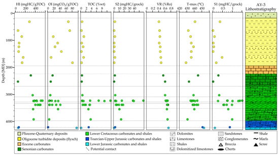 Multi-depth plot illustrating several geochemical parameters; Tmax, S1, S2, HI, OI, TOC, with measured depth, related to the simplified stratigraphic column of the well AY-3. The units of the included parameters are shown on the figure and are discussed in Section 3.2.1 The different colors incorporated are related to the stratigraphy of the well, illustrated on the right-hand side.