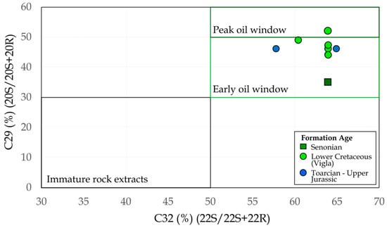 Vigla shales have C29% 20S/(20S + 20R) of 44–49%, C31% 22S/(22S + 22R) of 59–64%, C32% 22S/(22S + 22R) of 58–64% and Ts/(Ts + Tm) of 30–57%, with Posidonia shales also ranging within this spectrum. Homohopanes suggest that the oil generation has been reached [77]. On the other hand, Ts/(Ts + Tm) appears to be low for some Vigla shale samples, which might be a source-related issue [79].
