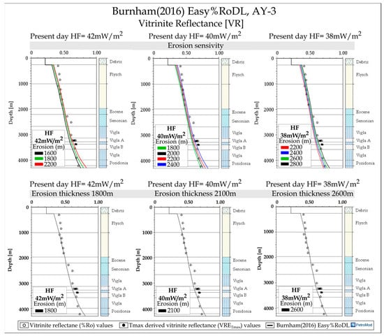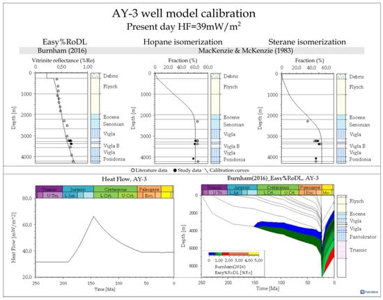 Thermal history and burial of the AY-3 well, Internal Ionian geotectonic zone, was performed using the PetroMod 1D 2020.1, Schlumberger software package (Schlumberger; version 2020.1). The stratigraphy used is shown in Figure 2b. Relevant lithologies were built with the PetroMod Lithology editor, based on cutting and core lithological information provided by [9]. The assumptions used for the modeling are: (1) layer thicknesses, lithology, and ages are derived from [9]; (2) an almost instantaneous thrusting duration [64]; (3) a sediment–water interface temperature (SWIT) of 15.84 °C based on [65]; (4) paleo-water depth and sea-level changes were neglected, as overburden thickness is the chief factor in thermal evolution [66]; (5) the thermal maturity model was constrained by organic thermal indicators (VR and biomarkers both from [9] and own samples analyzed in this study, with VR being calibrated using the Burnham Easy%RoDL [67,68]). Lastly, (6) present-day heat flow (HF) values are around 40 mW/m2 based on [69,70], and (7) the HF trends are generated based on [71] considering a Jurassic rifting (Pliensbachian–Tithonian) that reaches an HF of 66 mW/m2 in the Upper Jurassic.