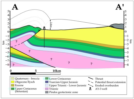 (a) Geological map of the AY-3 well location area in the Internal Ionian geotectonic zone (compilation of [15,16,18,58,59]). (b) Stratigraphic column of the AY-3 well, reconstructed after [9] and (c) Simplified cross-section (A-A’) in W–E direction crossing a backthrust sequence, the AY-3 well and the Pindos thrust from west to east. Question marks “?” indicate uncertainty about the related displayed layers.