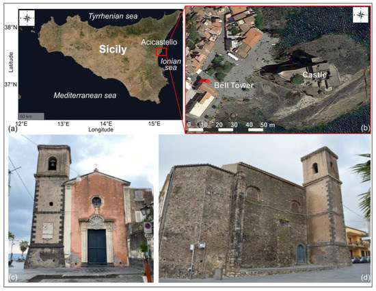 (a) Location of Aci Castello municipality (Sicily), (b) position of San Giuseppe’s bell tower (highlighted in red), (c) west and (d) north views of the San Giuseppe church.