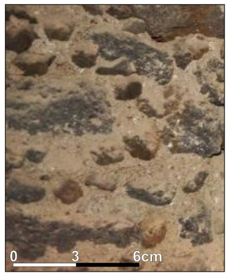 The study area is located at the easternmost part of Aci Castello City, in close proximity to the volcanic cliff holding up the village’s castle (Figure 3). From a geological point of view, such promontory represents a peculiarity, because it is among the few spots hosting volcanic outcrops related to the very first stages of Mount Etna formation (about 500,000 years ago), which mainly occurred in a submarine environment, and is formed by subvolcanic basaltic intrusions [29]. The basaltic cliff is surrounded by a prehistoric lava flow. Well-preserved outcrops of such lava flow occur along the coast, where a jointed volcanic rock mass, with a massive vesicular intact rock texture, can be observed. It belongs to the Pietracannone formation, which is representative of a volcanic succession with mineralogical composition ranging from basaltic to benmoreitic. Lavas are aphyric to highly porphyritic in texture, with phenocrysts of plagioclase, pyroxene, and olivine variable in quantity and size [30].