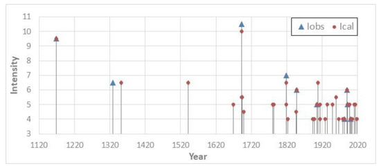 The seismic history is not complete due to the very few observed intensity values. Therefore, in order to evaluate the completeness of the site catalogue and to improve its reliability for hazard purposes, calculated site intensities Ical have been obtained using both the parametric Italian catalogue [36] and the cubic attenuation model proposed by Magri et al. [37]. This led us to include in our site catalogue further 30 earthquakes, without historical information, 6 of which with 5–6 ≤ Ical ≤ 6–7 (Figure 4). In the Database of the Italian Catalogue [36], there is no intensity observed for the 1908 earthquake, but from the computed intensity, we obtained Ical = 6–7 compatible with the observed damage at the bell tower.