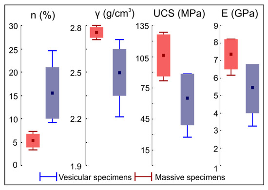 Mechanical uniaxial compression tests returned uniaxial compression strength (UCS) values between 80.6 and 128.2 MPa for massive specimens and between 28.1 and 86.3 MPa for vesicular ones. Lower UCS values are related to the more porous rocks, which show also lower elastic modulus, index of a slightly higher deformability attitude under stress. Young’s modulus values, indeed, are between 3.2 and 8.2 GPa (Figure 5). According to Singh and Ghose [44], resulting UCS values are characteristic of a medium to strong rock and of a strong to very strong rock for vesicular and massive specimens, respectively.