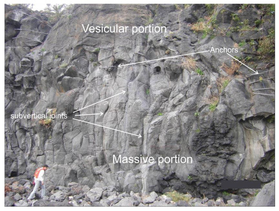 Rock mass characterization was carried out through a geomechanical survey at a 15 m high volcanic rock mass showing a massive basaltic succession, affected by a certain degree of fracturing, located a few tens of meters southeastwards away from the studied church. The rock mass has a columnar aspect, typical of massive volcanic flow succession, and shows a different degree of vesiculation, with a vesicular texture at its higher portion and a massive rock structure at its lower portion (Figure 6). Block shape is mainly prismatic, with an average size greater than 1 dm, and there are widespread anchors to secure local instability features. The rock mass survey was carried out according to the objective sampling criterion proposed by ISRM [45] by evaluating all the discontinuities intersecting a scanline. Based on surveyed data, four main discontinuity sets were recognized, with a general subvertical attitude, except for a subhorizontal set, and an average normal set spacing ranging from 35 to 57 cm. Joints show a different aperture grade, ranging between 0 and 10 mm, a slight weathering and no filling material.