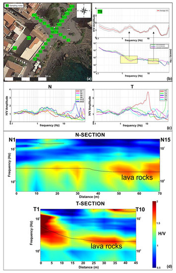 Furthermore, the H/V spectra related to some measurement points (Est1, Est2, N4, N5, T7–T9) show at higher frequencies, between 10 and 30 Hz, an additional peak, characterized even in this case by low amplitude values (H/V amplitude < 2) (Figure 7b,c).