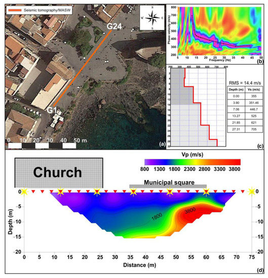 The Vs-depth profile (Figure 8c) shows Vs values of about 350 m/s within the depth interval of 0–4 m; below this layer, velocities gradually increase with depth, reaching, at the maximum investigated depth, Vs values of about 700 m/s. The first layer, characterized by low velocity values, is attributable to the presence of loose material; the gradual increase in velocity values with depth is in agreement with the presence of an ancient fractured lava flow. This represents the volcanic bedrock, whose outcrops were surveyed in the close proximity of the church.
