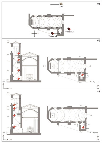 (a) Velocimeters’ position in plan of the bell tower of San Giuseppe (Aci Castello, Sicily); (b) velocimeters’ position in section of the bell tower of San Giuseppe (Aci Castello, Sicily). Vertical n. 1 (see Table 4); (c) velocimeters’ position in section of the bell tower of San Giuseppe (Aci Castello, Sicily). Vertical n. 2 (see Table 4).