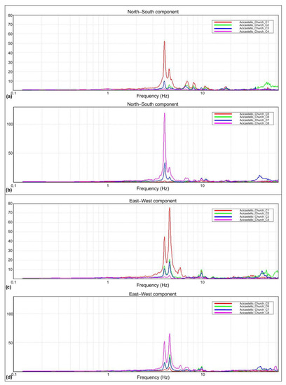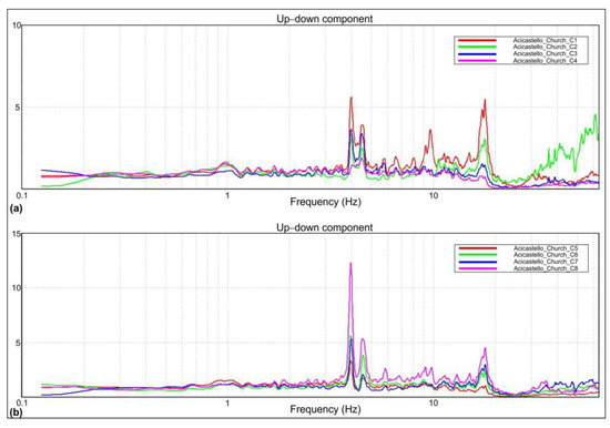 The obtained H/V spectra were analyzed together with the relative single components Fourier spectra to distinguish peaks connected with stratigraphic changes from those linked to anthropic noise [51,52]. In fact, when an impedance contrast is present in the subsoil, the Fourier spectra of single components show the characteristic “eye-shape”, formed between horizontal and vertical components [53]. On the contrary, when the three components move upwards at the same time, the related H/V peak is caused by anthropic noise.