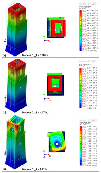 Figure 13 shows the mode shapes of San Giuseppe’s bell tower identified through numerical analysis on Midas FEA. The first three vibrational modes have been identified. The first and the second modes are bending modes, respectively, on the Y-axis (i.e., east–west axis) and X-axis (i.e., north–south axis) direction; the third mode is a torsional mode around the Z-axis (Vertical axis). Associated frequency values are close to the experimental ones (Table 5).