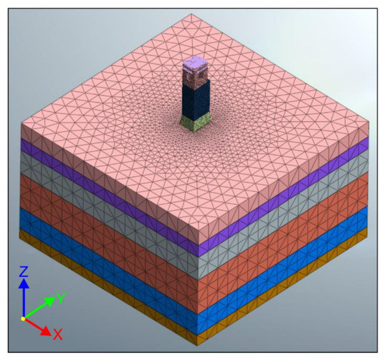 A volume of soil 50 × 50 m and 30 m deep was discretized, divided in six horizontal layers whose physical and mechanical properties determined from the geophysical survey are listed in Table 3, as schematically shown in Figure 14. The bedrock was assumed at a depth of 30 m, where the fixity constraint was assigned, whereas unidirectional boundary conditions orthogonal to the lateral sides of the soil volume were assigned. The planar dimension of the volume is such that, at the edge, the vertical deformations in the soil due to the tower’s self-weight are almost completely elapsed. A linear elastic isotropic model was adopted for the soil.