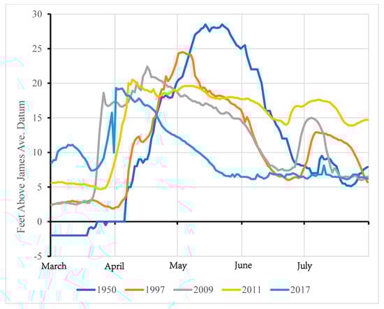 Historic Red River water levels at James Avenue, Winnipeg, 1950–2017. The zero point of the gauge at James Avenue is 727.57 ft. above mean sea level. (Sources of data: City of Winnipeg, and Water Survey of Canada, 2023).
