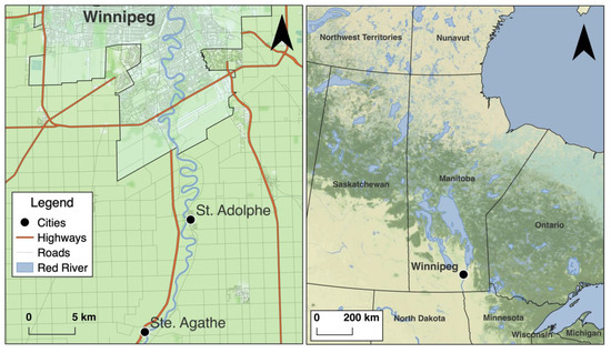 The field study portion of this research was conducted in the communities of St. Adolphe and Ste. Agathe, which are located in the Rural Municipality (RM) of Ritchot, Manitoba. These communities were primarily selected due to their high vulnerability to floods as a result of their geographic location (Figure 3), their experiences with flooding in recent decades, and the RM of Ritchot’s willingness to participate in the research. Additionally, these communities were also selected for their geographical accessibility, and their proximity to four rivers: the Red River, the Rat River, the LaSalle River, and the Seine River. The Red River is the largest of the four, flowing north from the United States, past Ste. Agathe and St. Adolphe, through the City of Winnipeg, and ultimately draining into Lake Winnipeg. All communications, interviews and analysis involving individuals in this study was conducted following Research Ethics Approval # HE2021-0126.
