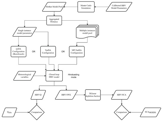 The hindcast period starts from 1 October 2008 and ends on 30 September 2012, and has daily time steps. The forecast lead time is set to 10 days (0 to 240 h with 24 h increments). The initial conditions were improved by assimilating both streamflow and snow data under deterministic and probabilistic variational DA. Improved states were utilized as the best initial condition to generate perfect forecasts based on observed forcing data. This also eliminates forecast uncertainty, which is out of the scope of this study. Generated model pool parameter sets (mpi1, mpi3, mpi5, and mpi10) were implemented into data assimilation through the HBV hydrological model in a hindcasting mode. The configuration intended to produce both streamflow and SCA forecasts. Since VarDA is deterministic, it produces a single forecast for each time step up to the lead time, whereas MP-VarDA produces an ensemble set of forecasts considering multiple initial conditions and model parametrization.