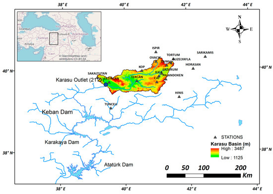 The developed methodology was tested in the Karasu River catchment, a major branch of the Euphrates River in Türkiye. The study area and station network are shown in Figure 2. The basin with a drainage area of 10,275 km2 has an elevation range from 1125 m to 3500 m and a hypsometric mean elevation of 1983 m. The main land cover types are pasture, cultivated, and bare land. Snowmelt streamflow in the mountainous eastern part of Türkiye is of great importance. It constitutes approximately two-thirds of the volume of the total yearly streamflow during the spring and early summer months. The streamflow data were collected at the outlet of the basin (2119 station). Karasu Basin is divided into 10 elevation zones (bands) between 1125–3500 m. A total of 18 climatologic and automated weather operating stations (AWOS), ranging in elevation between 981 and 2937 m, are located in and around the basin (Figure 2). The required input data for the HBV model are daily total Precipitation (P), daily average Temperature (T), and daily Potential Evaporation (PE). In this study, input data are provided as zone-based areal values calculated by the Detrended Kriging distribution method [39].