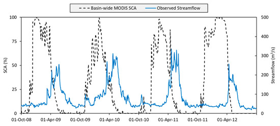 Observed daily SCA data were converted to daily time series for each elevational zone for the study period. HBV model produces SWE, converts it to SCA, and utilizes the observed SCA information for the data assimilation part. Figure 4 depicts the variation of SCA of the whole catchment and streamflow at the outlet of the basin for the 2009–2012 WY period. During the accumulation period, the streamflow values are low while the major portion comes during and after the start of the melting season. Besides, remote sensing snow products (MODIS, IMS, MSG-SEVIRI) provide above 90% accuracy with ground measurements in the region [41,42,43,44].
