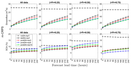 Figure 7 and Figure 8 compare the forecast performance using m-CRPS and BSS metrics for VarDA and MP-VarDA experiments, respectively. The performances of the noDA-mpi1 experiment are also shown in the related figures. Since m-CRPS has the same unit as the observations, it provides useful information about the assessment. The m-CRPS of the deterministic experiments are identical to the mean absolute error. The ranges for the streamflow data have wider bounds, and thus the graphs are given in different y-axis scales for m-CRPS, while SCA is kept the same. The m-CRPS of a perfect forecast would be zero, while the BSS for a seamless set of forecasts would be one. Since BSS is always based on a threshold value, the presentations are only available for exceedance probability thresholds, while m-CRPS can be calculated for both all data and forecasts above these thresholds.