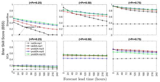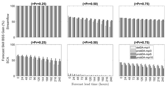 Figure 10 compares the percent forecast BSS-gain of VarDA and MP-VarDA experiments with respect to noDA-mpi1 benchmark simulation. Increasing the mpi in MP-VarDA also enhances forecast skills gains. The gains in streamflow increase above 100% for Pr = 0.25 because of the negative (very poor) BSS performance of the noDA-mpi1 simulation. The BSS gains look similar for the streamflow forecasts above the other thresholds (Pr = 0.50 and Pr = 0.75). The main improvement by MP-VarDA is detected especially for the SCA forecasts above low and high thresholds (Pr = 0.25 and Pr = 0.75). This is also due to the uncertainty capture capacity of the probabilistic case where a larger spread is accounted for in comparison to a single deterministic forecast.
