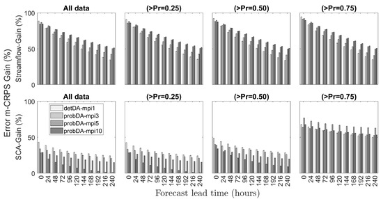 The results are analyzed with percent gains of the data assimilation methods to find the most effective method in the hydrological forecasting system. Figure 9 compares m-CRPS based error gain (%) for VarDA and MP-VarDA experiments with respect to noDA-mpi1 benchmark simulation. Higher error gains are detected in the MP-VarDA against deterministic VarDA, especially for streamflow forecasts. The error gains intuitively decrease with respect to lead time, but still stay within a considerable level (34% and 50% for detDA-mpi1 and probDA-mpi10 in all data analyses, respectively). Increasing the number of mpi clearly increases the gains. This situation was observed for all data, as well as in different forecast groups above the thresholds. Therefore, it can be stated that MP-VarDA outperforms VarDA for streamflow forecasts in the case of assimilating streamflow and SCA. There is a limit where increasing model pool instances does not contribute further. For example, probDA-mpi5 and probDA-mpi10 seem to give similar results. Compared to streamflow, lower m-CRPS error gains in SCA were detected for both methods. Additionally, VarDA gives a higher gain for all data and the forecasts greater than Pr = 0.25 and Pr = 0.50, while MP-VarDA slightly increases the gains of the forecasts which are greater than Pr = 0.75, especially for probDA-mpi5. This is also detected for longer lead times. However, it is not straightforward to classify which method or mpi gives more accurate results in a general sense.