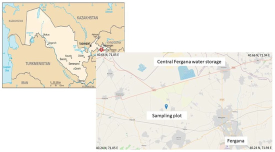The dominance of humans over the environment, particularly on soil and soil cover, has expanded as consciousness and thinking evolved throughout our development as a species. Anthropogenic activities have a strong influence on the gradual evolutionary development of soils [1]. The south of Uzbekistan is overpopulated and strongly affected by urbanization and agriculture. The Fergana valley belongs to three nations—Uzbekistan, Kyrgyzstan and Tajikistan. The current population of this geographical region is over seven million people. Cities and large villages are located in agricultural landscapes with numerous storage and processing facilities for agricultural products. The agriculture in the region is highly dependent on the redistribution of water from the highlands to the lowlands. Fergana city itself is located at an altitude of 580 m, while one of the oldest cities in the world, Osh, is located at an altitude of 963 m. The Fergana Valley region belongs to the mountain-piedmont areas. Irrigation plays a decisive role here, and water deficits affect the hydrological systems of Central Asia. Intensive irrigation of these lands began in the Soviet period and continues to this day. At the same time, there are a number of problems, including geopolitical ones, associated with the use of irrigation canals and rivers on the border of the three countries; these problems escalated after the collapse of the Soviet Union.