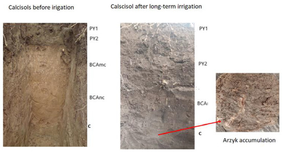 The soils studied revealed significant changes in morphological organization due to the irrigation effect. The yellowish-pale profiles of Calcisols showed gray streaks and the formation of dense hardpan (arzyk-shokh) in the middle part of the soil profile. Changes in environmental conditions lead to changes in the agro-bio-geochemical properties of soils due to evolutionary processes [36,37] and, therefore, to changes in the genetic horizons of the soil section and its natural structure and properties, leading to an increase in the level of natural fertility. In accordance with this, the properties of soils can be divided into the two following groups: residual properties inherited from the parent rocks—lithorelicts [38] or acquired in the process of soil formation; or properties arising during the development of soils during the stagnation of environmental conditions [1]. The morphological features which are characteristic of the previous stage begin to gradually disappear or transform in the soil profile and new features corresponding to the second stage of soil formation emerge. The grayish color of the soil may therefore be seen as an attribute of soil irrigation process.