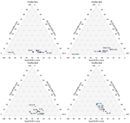 Irrigated soils were identified as Solonchaks with hardpan instead of the Calcisols which existed before irrigation. These were preserved until the beginning of the 1980s in the form of spots in small areas within the agro-developed areas [36]. Together with them, significant areas were prepared for development and reclamation or were abandoned due to ineffective development. These soils are characterized by a clayey texture (Figure 2), strong salinity, high carbonate content, and an extremely compacted structure. Owing to the aforementioned influence of anthropogenic factors, the soil profile has undergone complex changes depending on the duration of the development period, as well as on the applied measures 50–70 years after the beginning of the development of arzyk soils and 35–40 years from the time of their primary completion. Active human influence on the natural balance of Central Fergana is largely manifested in intensive capital land planning, construction of sewerage systems and aryks (ditches), as well as collector–drainage and irrigation systems. The main processes manifested in changes in condition related to irrigation and the application of fertilizers. Irrigation played an important role in the activation of soil chemical composition changes, accelerating weathering processes, leaching, and in the redistribution of soil components. All the investigated soils were comparable in terms of texture their class and the details of particle size distribution (Table 2).