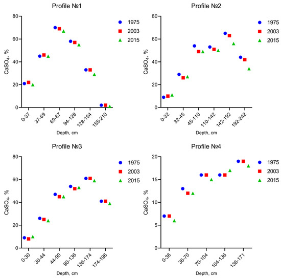 In some layers, the abundances of both total salts and phytotoxic salts were found to have increased; in other words, redistribution had taken place. Additionally, the salinity type became stable, i.e., sulfate–calcium. The pH of the soil fine earth was close to neutral due to the presence of normal carbonates [39]. The pH of soils under sodium salinization should be more than 8.5. As such, the soils of Central Fergana are characterized by normal carbonate salinization. There were no essential changes in the gypsum state of the soil (Table 4, Figure 4), and thus, there has been a stable development of the soil from 1975 until the present.