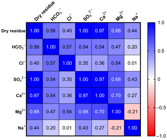 Correlation analyses (Figure 5) showed that sulfate anions and calcium cations had maximal correlations with dry residue. In addition, there was strong correlation between sulfate and calcium. The lower and negative correlation is characteristic for magnesium and sodium ions, as these cations are parts of opposite trends of salinization.