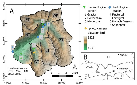 (A): The Horlachtal with its sub-catchments presented with a hillshade generated based on the 2022 LiDAR data. The locations of the stations mentioned are shown as well. (B): Location of the study area.