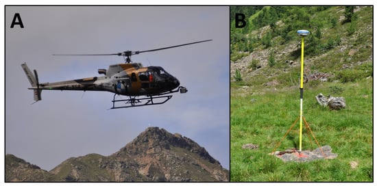 LiDAR data acquisition in Horlachtal. (A): VP1-HeliCopterPod mounted on an Airbus Helicopters H125 Ecureuil. (B): One of two dGNSS base stations on the ground.