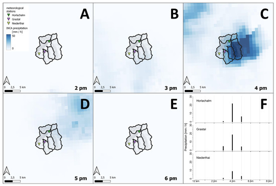 (A–E): The precipitation event on 20 July 2022 as detected by the INCA system. For comparison, the graphs in (F) represent the measurements of the meteorological stations in Horlachtal.