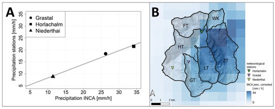 Although the number of meteorological stations in the study area is very limited for a linear regression and therefore prone to uncertainties, we detected a linear relationship between the INCA values and the rainfall measurements at the three stations, with the aforementioned and expected slight overestimation of the amount of rainfall by the INCA data [52]. Figure 7A shows the recorded precipitation of the three stations during the rainfall event on 20 July 2022 between 4 p.m. and 5 p.m., compared with the corresponding INCA cell values of the same timeframe. The calculated linear model showed a strong correlation between the two data sources (R² = 0.97) and was therefore used to correct the INCA cell values during this precipitation event (Figure 7B).