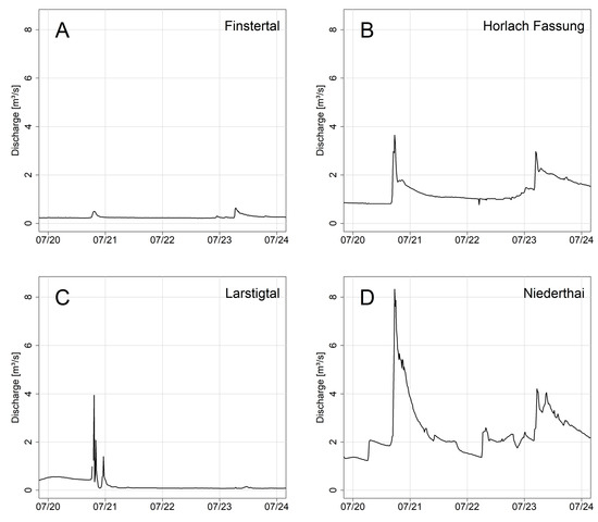 Discharge measurements at the four gauges (A–D) in Horlachtal during the events in July 2022.
