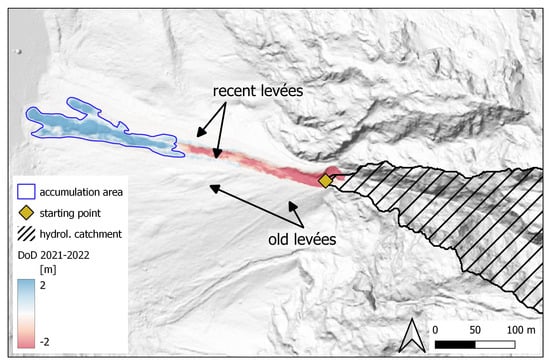 In the calculated DoD, the topographic changes due to the debris flows of July 2022 become visible. Figure 9 shows an example of a debris flow in LT. The starting point of the debris flow is at the contact zone between the talus cone and the steep bedrock section above (hydrological catchment). The red DoD cells in the transit zone indicate erosion and incision into the talus slope. Right before the transition into the accumulation area (blue), levées have formed on both sides of the transit channel. Typical landforms of past debris flows are also visible in the underlying hillshade.
