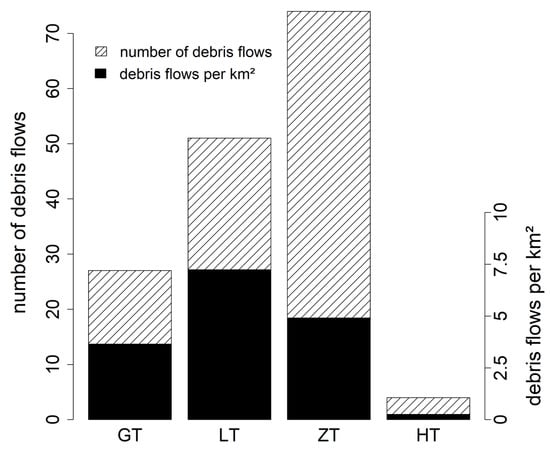 Figure 11 shows the total number of triggered debris flows in the respective sub-catchments. However, as the different sub-catchments vary in size, we have also normalised the number of debris flows for each square kilometre. Although the total number of detected processes was highest in ZT, more debris flows were initiated in LT when we related them to the area.