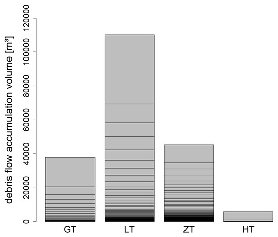 The triggered debris flows were of very different magnitudes, with accumulation volumes ranging from 6.4 m³ to almost 41,000 m³ (see Figure 10). A total of 199,267 m³ of debris flow material was deposited during the two events in July 2022 in Horlachtal. Figure 12 displays how the volumes were distributed among the sub-catchments. In each of the areas, debris flows of lower and higher magnitude occurred. However, there were many large volumes recorded in LT, including the largest one (40,907 m³), which alone deposited more debris than, for example, all GT debris flows together (37,869 m³). Another interesting point was the relatively low total volume in ZT compared with the very high number of debris flows initiated there. Thus, we can register many small accumulations for ZT.