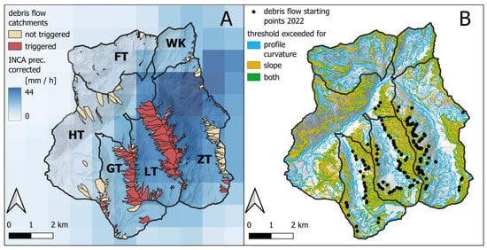 Figure 13 additionally shows that aspect was not a decisive factor for the spatial distribution of debris flows during the 2022 event. In GT, most processes were initiated on west-facing slopes. In contrast, almost all debris flow systems in LT were triggered, indicating a possible peak of rainfall intensity in LT. In ZT, debris flows were almost exclusively triggered on east-facing slopes.