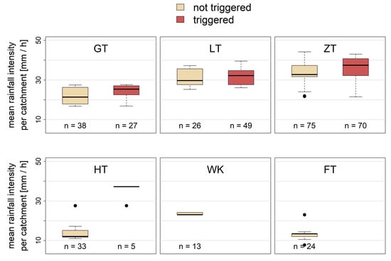 Considering the mean rainfall intensity at each individual catchment for the crucial hour of the July event (Figure 14), we can compare them by triggered and non-triggered catchments. In all sub-catchments, with both triggered and not-triggered debris flow systems, the median rainfall intensity of the triggered catchments was higher than that of the non-triggered catchments. This difference is most pronounced for HT. In FT, rainfall intensities at every debris flow catchment are likely to be well below the proposed threshold of 20 mm/30 min [28,32].