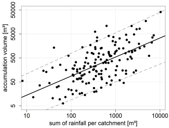 The debris flow catchments are not only an important factor for the spatial distribution of slope-type debris flows, but their morphometry is also known to influence the corresponding debris flow magnitudes [61,62,63,64]. This phenomenon has also been observed in the Horlachtal, where the size of the catchment is one of the most important parameters correlating with the debris flow volumes [29,32]. Since we have information on the spatial distribution of the precipitation event, we can use the total amount of rainfall for each of the debris flow catchments triggered during the 2022 event. Figure 15 shows the relationship between the amount of rainfall and the corresponding debris flow accumulation volumes of the debris flows of July 2022 in Horlachtal. The calculated correlation coefficient Spearman’s rho of 0.6 is slightly higher than the relationship between volume and catchment area in Rom et al. [29] (rho = 0.46) and in a similar range compared with De Haas and Densmore [65] (relationship between volume and catchment area: r = 0.63) and Franzi and Bianco [66] (rho = 0.639). A p-value lower than 0.001 indicates a highly significant relationship between the parameters. Using the 5% quantile regression line and the 95% quantile regression line (Figure 15) as lower and upper bounds, we can estimate the range of possible debris flow volumes for rainfall amounts. In the case of the 2022 Horlachtal event, the minimum accumulation volume is derived by
