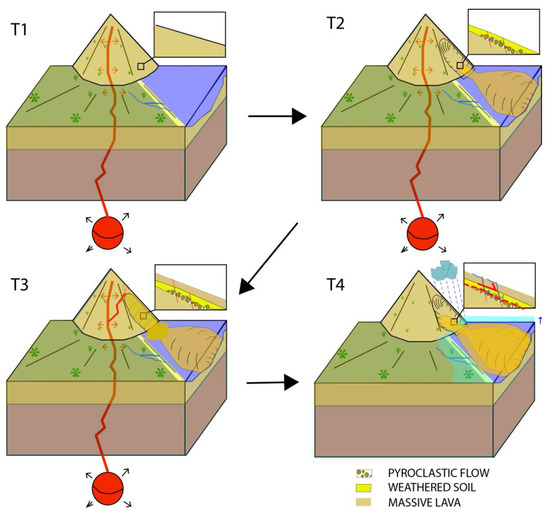 Complex evolution of volcanic edifices and locations of deep weakness zone, (T1) Young volcanic edifice composed of massive lavas, (T2) Volcanic edifice after a giant landslide caused by a volcanic process, where pyroclastic flows, as well as soil and lava weathering, occur, (T3) Filling of the landslide scar by thick volcanic lavas above the pyroclastic debris and the weathered soils, (T4) Deep rooting of the landslide into the weakness zone favored by meteoric water infiltration and/or sea level loading in the case of an old and complex volcano and/or the presence of deeply incised canyons.