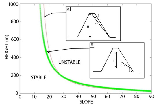 Using the same method, it is also possible to calculate the maximum stable height for a second kind of landslide geometry (Figure 2B, concave geometry model) using the following equation: