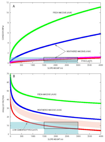 The mechanical properties of volcanic rocks are strongly dependent on their alteration [34] and stress loading. The cohesion and angle of friction were estimated by Rodriguez-Losada et al. [5] for different volcanic rocks under different slope heights. Cohesion C can be obtained using the equation C = kHl, where H is the slope height, and k and l are coefficients determined experimentally for different volcanic rocks [5]. For weathered, massive lavas, k = 0.04 and l varies from 0.41 to 0.60. For weakly cemented pyroclasts, k = 0.05 and l = 0.5. The angle of friction ϕ could also be estimated using the equation ϕ = a ln(H) + b, where a and b are obtained experimentally. Rodriguez-Losada et al. [5] showed that very low friction angles of <13° are obtained at depths >1000 m for low cemented pyroclasts (a = 6; b = 54). A volcanic edifice composed of low cemented pyroclasts has cohesion values between 0.5 and 1 MPa at depths of 1500–3000 m (Figure 3A). At this depth, a theoretical volcanic edifice with weakly cemented pyroclasts has friction angles between 6° and 10° (Figure 3B).