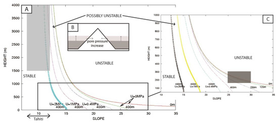 The size of the expected landslide depends on the initial slope of the relief. Locally, as in a deeply incised canyon of volcanic islands, significant slopes can be observed. In the case of a significant slope (>25°), the critical value for the height of the stable relief is less than 300 m (Figure 4C). Consequently, smaller landslides can be triggered locally. When rotational landslides occur, significant slopes develop in the upstream part. The resulting relief may be close to the instability conditions that favor the development of new landslides and other retrogressive erosion processes. It can be difficult to distinguish the relief associated with numerous “small” landslides from that caused by giant landslides [32,70].