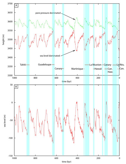 In the specific case of Polynesian climatic variation, where the climate is more humid during glacial maxima [42], as simulated here, the giant landslides generated by a pore pressure increase are expected to occur during glacial periods (Figure 5A). In the specific case of the Polynesian volcanic edifice, the period when the landslides are expected (i.e., the time when the maximum stable height H before a giant landslide is expected to occur) is different when the dominant process triggering the landslide is sea level loading or pore pressure loading (Figure 5A).
