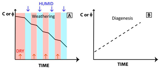 Rock mechanical properties C and ϕ decrease over time when exposed to weathering. The more weathering that occurs, the greater the decrease in C and ϕ. During humid periods, this decrease is greater than during dry periods (Figure 6A). In contrast, diagenetic processes are expected to improve the mechanical properties of rocks (Figure 6B). As pressure increases at depth, porosity and connectivity may decrease. In addition, mineralization at depth can also improve rock cohesion in certain cases.