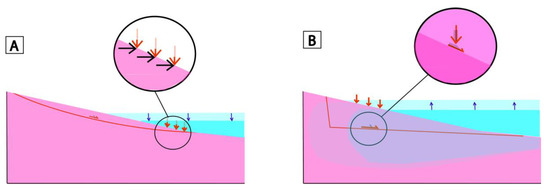 Influence of the sea level variation with respect to the position of the center of mass of the potential sliding area: (A) Slope instability caused by sea level lowering when the load is located at the base of the slope, (B) slope instability caused by a sea level rise above the center of mass with seawater infiltration.