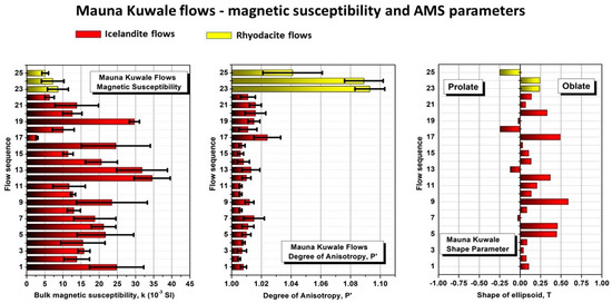 (left) Mean magnetic susceptibility of the flows in 10−3 SI units; (middle) magnetic degree of anisotropy, parameter P’; (right) shape of ellipsoid, T. Notice the Icelandite cooling units in red and Rhyodacite cooling units in yellow.