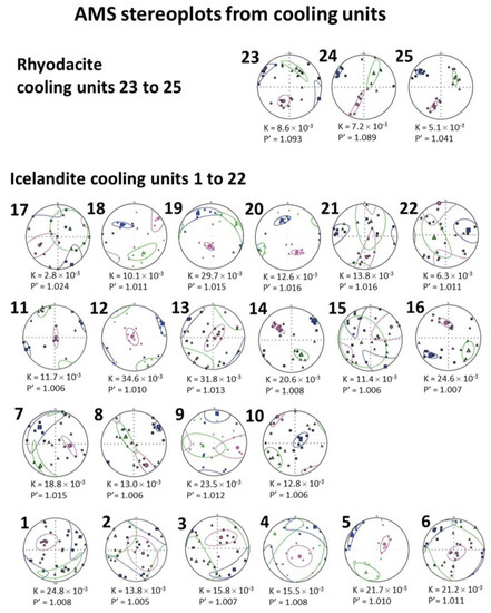 The shape of the AMS ellipsoid (Figure 2 right) is mostly oblate to neutral with just 3 cooling units showing a predominant prolate shape, two icelandite cooling units (13 and 18) and the uppermost rhyodacite flow (i.e., 25). This cooling unit also shows the lowest anisotropy of the rhyodacite cooling units (even so, much higher than the icelandite cooling units).