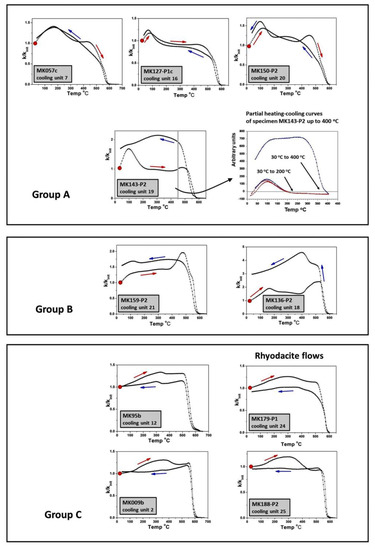 Overall, the samples show irreversible heating/cooling susceptibility curves. The susceptibility of the specimens at room temperature after the cooling phase (one full cycle) is usually equal or slightly higher that the initial susceptibility before heating. As a first approach, it is possible to systematize the thermomagnetic behavior in a sort of transitional group A−B and a distinct group C (Figure 4).