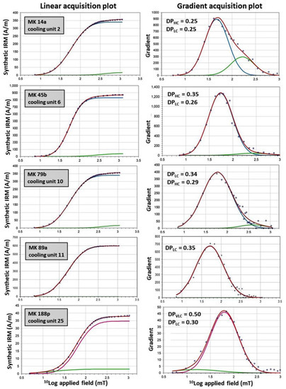 Low coercivity phases such as multidomain magnetite or ferrimagnetic pyrrhotite are characterized by steep magnetization acquisition and magnetic saturation at low applied fields around 0.1–0.2 T. Higher coercivity phases such as hematite, do not reach saturation until a field well above 1.0 T. According to [32,33] the IRM acquisition curves theoretically follow a log-normal distribution and are cumulative in intensity. Following this model, the curves fitted to the experimental IRM values, can be described by three main parameters: (1) the SIRM that measures the amplitude of the magnetization at saturation; (2) the B1/2 that measures the field at which half of the SIRM is reached and (3) the DP, a dispersion parameter, which measures the distribution of the coercivities of the mineral phases, thereby, characterizing the homogeneity of the population in terms of grain size and composition.